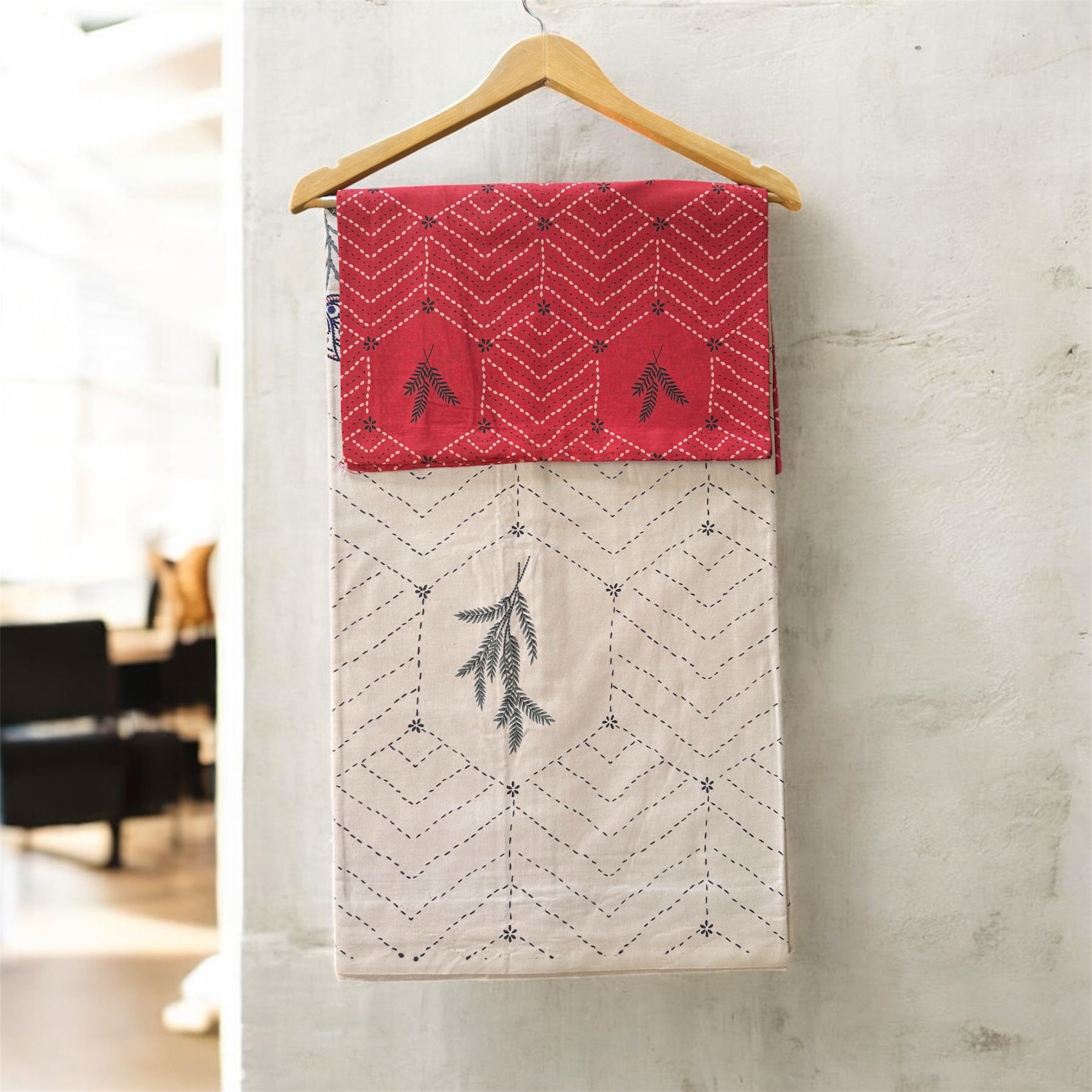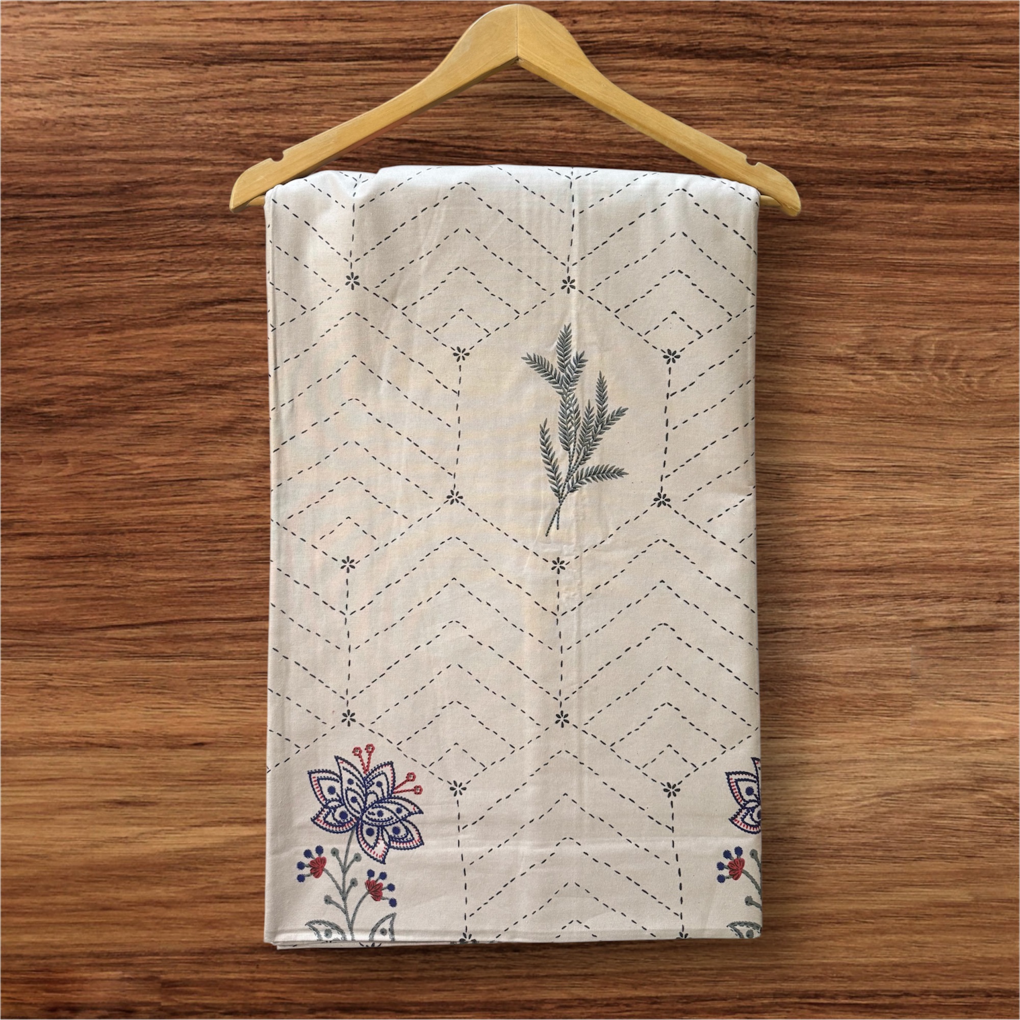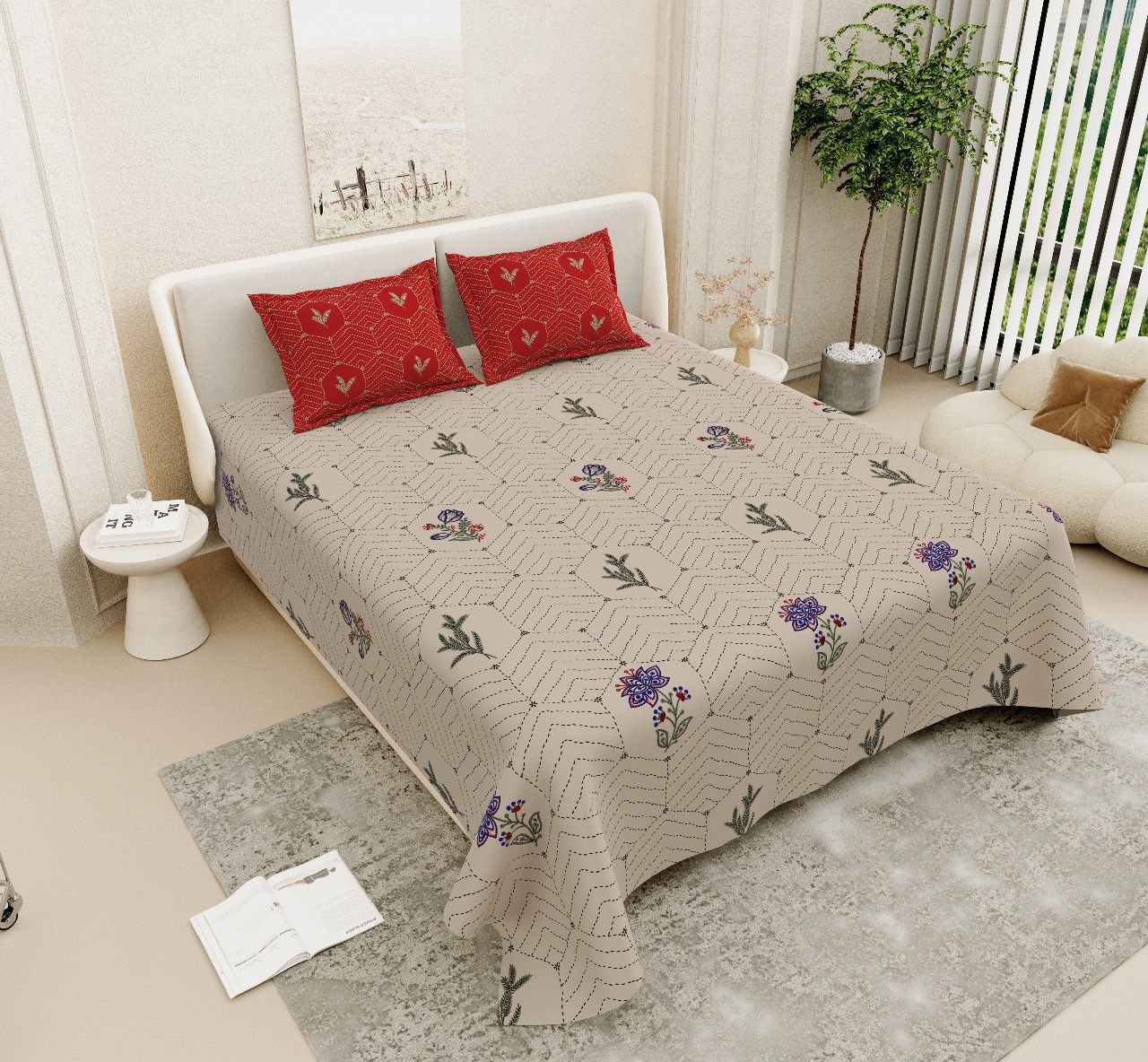 Transform your bedroom with this exquisite double bedsheet set featuring a sophisticated Brown base adorned with delicate floral embroidery and contemporary geometric patterns. The set includes a generously sized 275×275 cm double bedsheet and two coordinating pillow covers in striking red and Brown colour combinations. The design showcases intricate chevron patterns with dotted stitch detailing and elegant floral motifs, meticulously crafted to create a perfect blend of traditional and modern aesthetics. Crafted from premium 100% cotton fabric, this bedding ensemble offers supreme comfort and breathability, making it suitable for year-round use. The thoughtful design incorporates precise stitching that reflects superior craftsmanship, while the coordinated pillow covers complete the sophisticated look. The bedsheet’s versatile colour palette and pattern make it an ideal choice for contemporary home décor. Machine washable in cold water, this set maintains its pristine appearance through regular use. Perfect for standard double beds, this set combines style, comfort, and practicality for your bedroom.