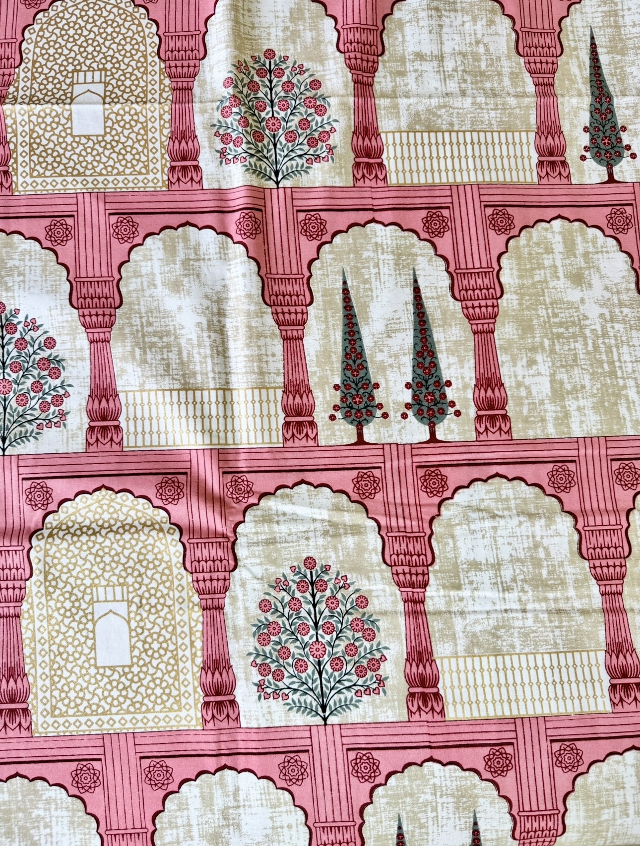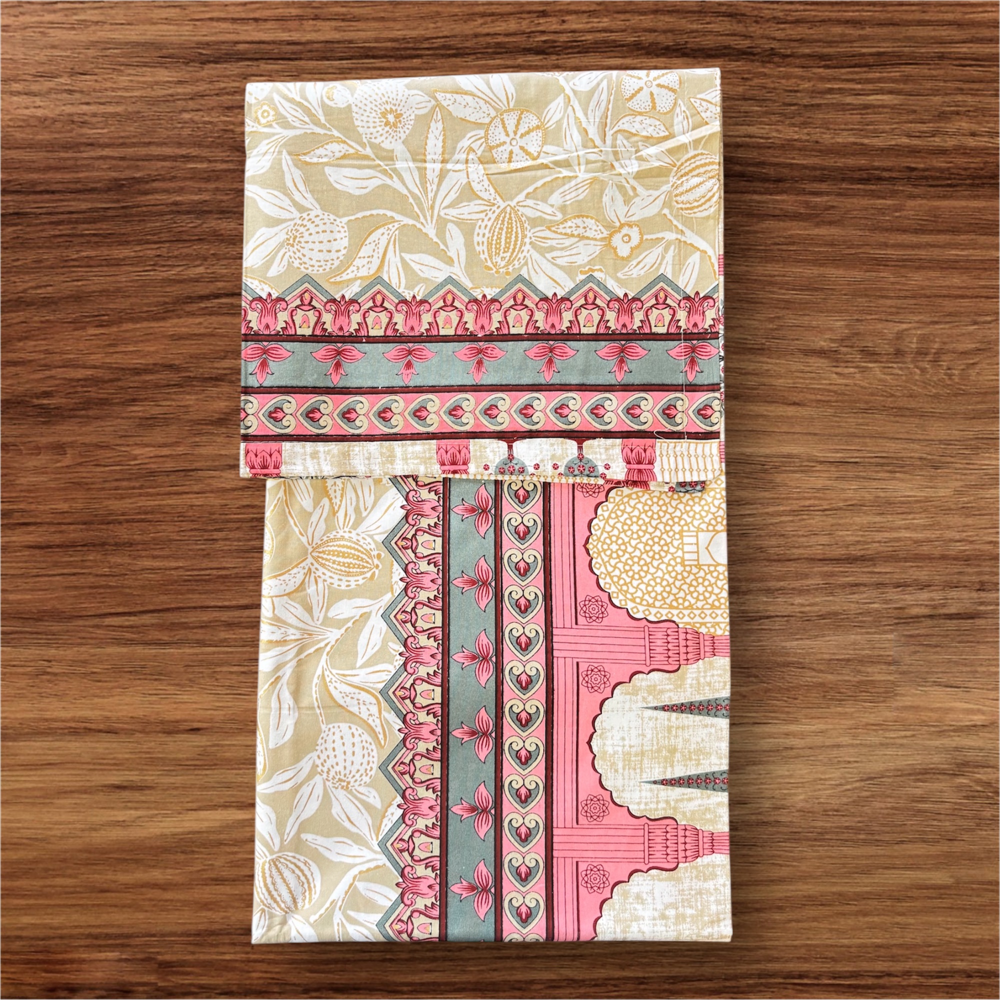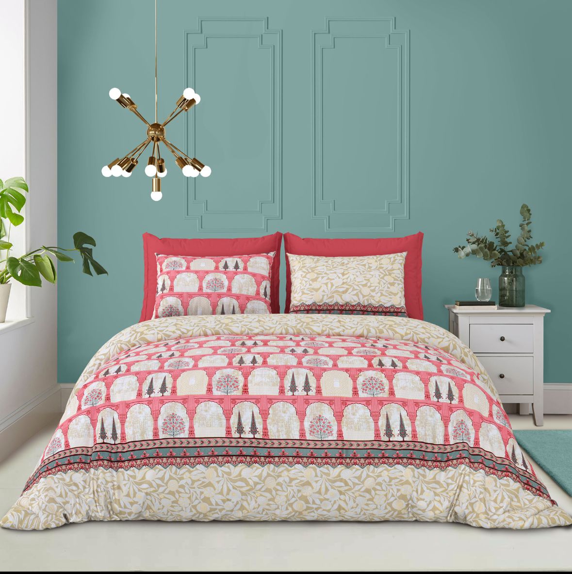 Transform your bedroom into a royal sanctuary with this exquisite double bedsheet set featuring a stunning architectural and floral design. The luxurious pattern combines elegant carrot hues with sophisticated gold accents, creating a perfect blend of traditional motifs and contemporary style. The spacious 108×108 inch (275×275 cm) flat sheet provides ample coverage for your bed, while the matching pillow cases, measuring 45×70 cm, complete the ensemble beautifully. The intricate design showcases delicate architectural elements in soft mint green, adorned with carrot floral accents and ornate borders featuring heart motifs and classical details. The premium fabric displays a meticulously crafted print pattern with subtle cream backgrounds and detailed botanical elements, making it an ideal choice for both modern and classical interior décor schemes. Perfect for master bedrooms or guest rooms, this bedding set adds a touch of sophistication while ensuring comfortable rest. The coordinated design elements create a cohesive look that elevates your bedroom’s aesthetic appeal.