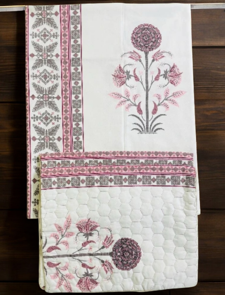 Transform your bedroom with this exquisite double bed sheet set featuring traditional Rajasthani prints and intricate floral designs. The pure cotton fabric, woven with a premium 360 thread count, offers supreme comfort and durability. The set includes a stunning white bedsheet adorned with multicolour floral and bird motifs, complemented by a beautiful geometric border pattern, along with two matching quilted pillowcases. Measuring 230 x 254 centimetres, this generously sized bedsheet provides ample coverage for double beds. The traditional block printing technique showcases authentic Indian craftsmanship, while the quilted texture adds an extra layer of luxury. Machine washable for easy maintenance, this bedsheet set combines practicality with aesthetic appeal. The pure cotton material ensures breathability and comfort in various weather conditions. Perfect for adding a touch of traditional elegance to your bedroom décor, this bedsheet set from Wee Hours exemplifies the perfect blend of comfort and style.