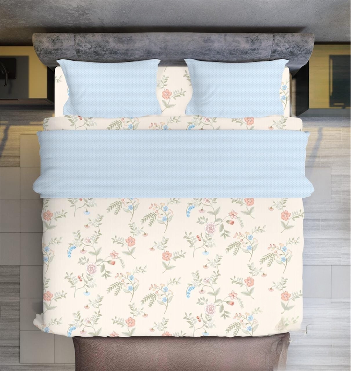 Transform your bedroom with this exquisite fitted double bed sheet set. The set includes a beautifully designed fitted sheet measuring 108×108 inches and two contrasting pillow covers that create a harmonious ensemble. The light yellow-coloured base features a delicate floral pattern with pink and blue blooms intertwined with sage green leaves, adding a touch of romantic charm to your space. The fitted sheet’s precise engineering ensures a snug fit, while the contrasting light blue dotted pattern on the pillow covers adds visual interest. Crafted with attention to detail, this bedding set combines functionality with aesthetic appeal. The fitted sheet’s elastic edges guarantee it stays securely in place, while the coordinating pillow covers complete the sophisticated look. Perfect for master bedrooms or guest rooms, this set offers both style and comfort for everyday use. Regular machine washing is recommended for maintaining the sheet’s pristine condition.