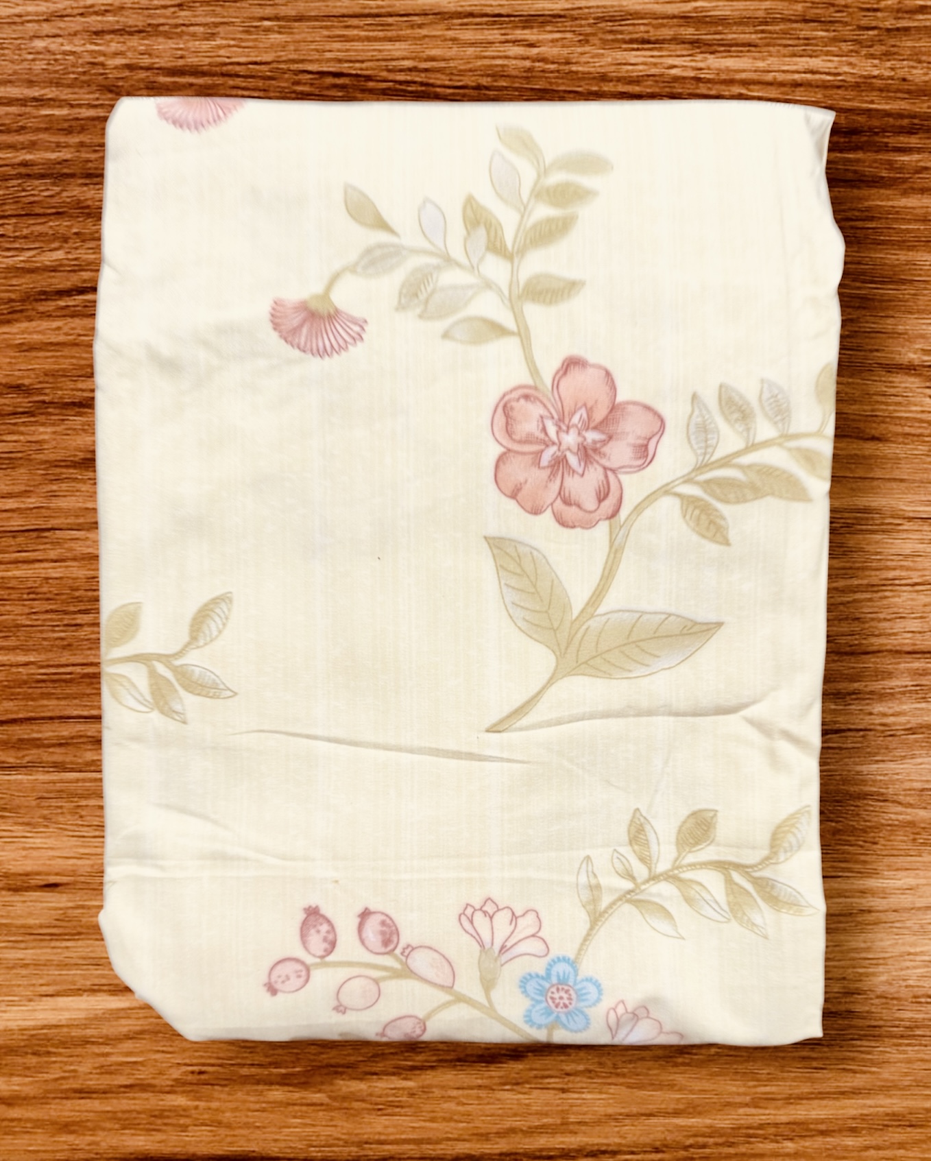 • PATTERN & DESIGN: Elegant floral print featuring delicate pink and blue blooms with sage green leaves on a cream background.