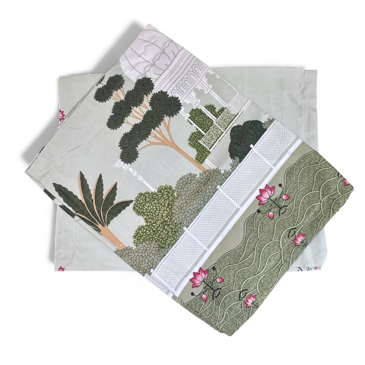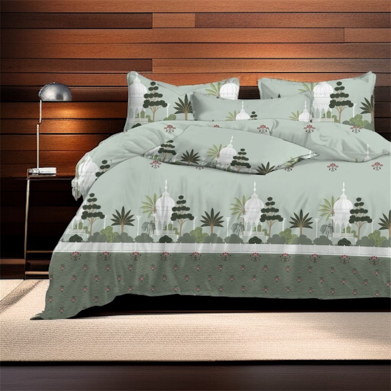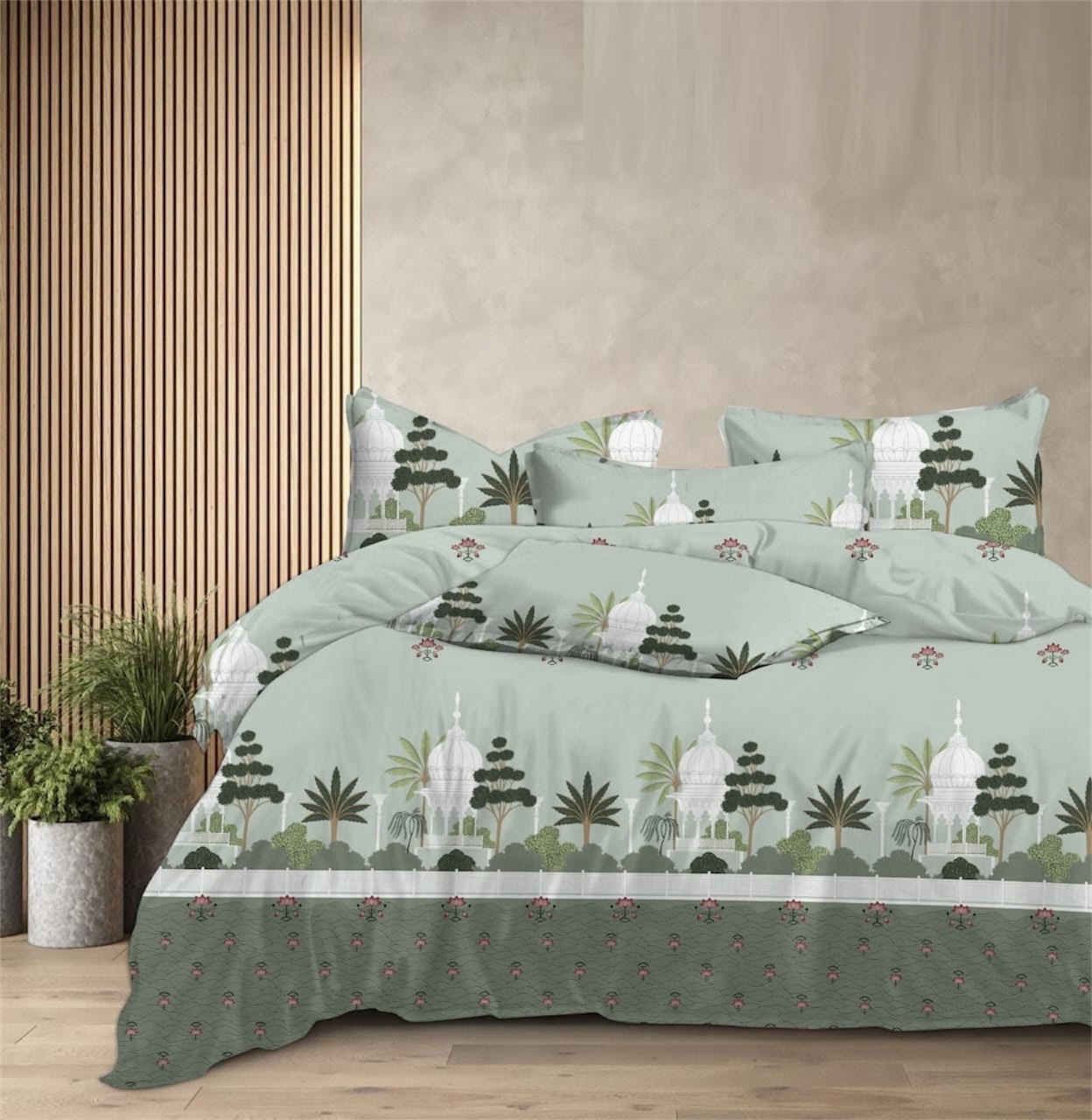 Transform your bedroom with this enchanting fitted double bed sheet set featuring a serene sage green palette adorned with elegant white domes, tropical palms, and delicate lotus motifs. The set includes a generously sized 275×275 cm fitted sheet and two coordinating pillow covers that create a harmonious ensemble. The design tells a story of tranquil gardens with its artistic blend of architectural elements and natural flora. Crafted from premium cotton blend fabric, this bedding combines visual sophistication with practical comfort. The fitted sheet’s elastic edges ensure a secure, wrinkle-resistant fit, while the fabric weight provides ideal durability and comfort through all seasons. The coordinating pillow covers feature complementary patterns that enhance the overall aesthetic. Perfect for standard double beds, this set offers both visual appeal and functional design. Machine washable for convenient care, this bedding set masterfully balances traditional artistry with modern convenience, making it an ideal choice for creating a peaceful bedroom sanctuary.