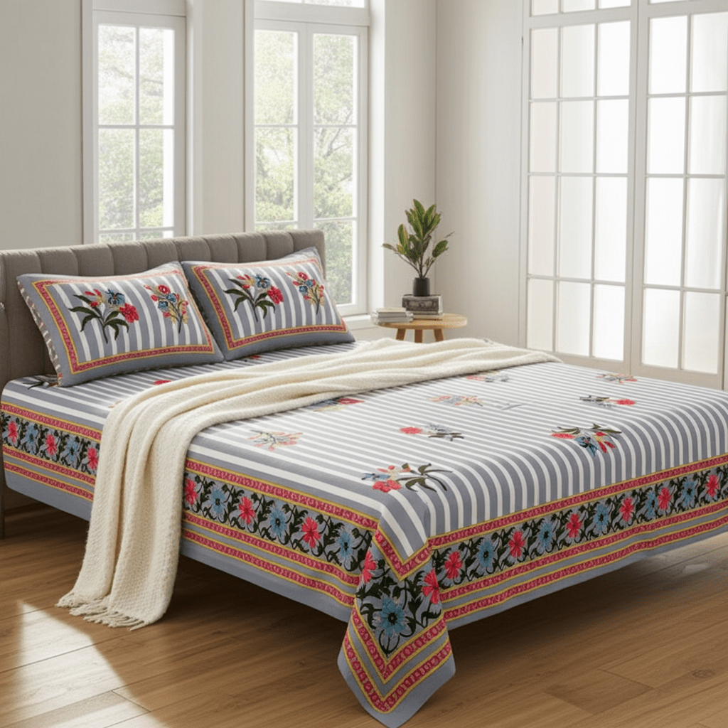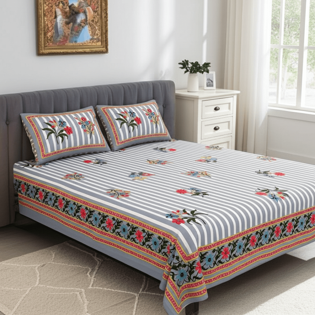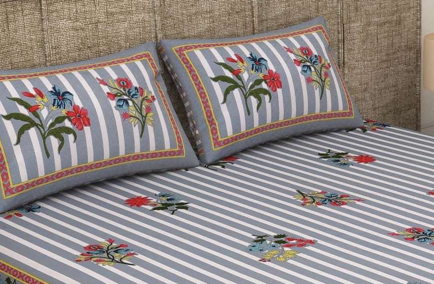Pure Cotton Bedsheet with 2 Pillow Covers, Super King Size 108×108 Inches, Floral Stripe Design, Grey and WhiteAvailability: In stock