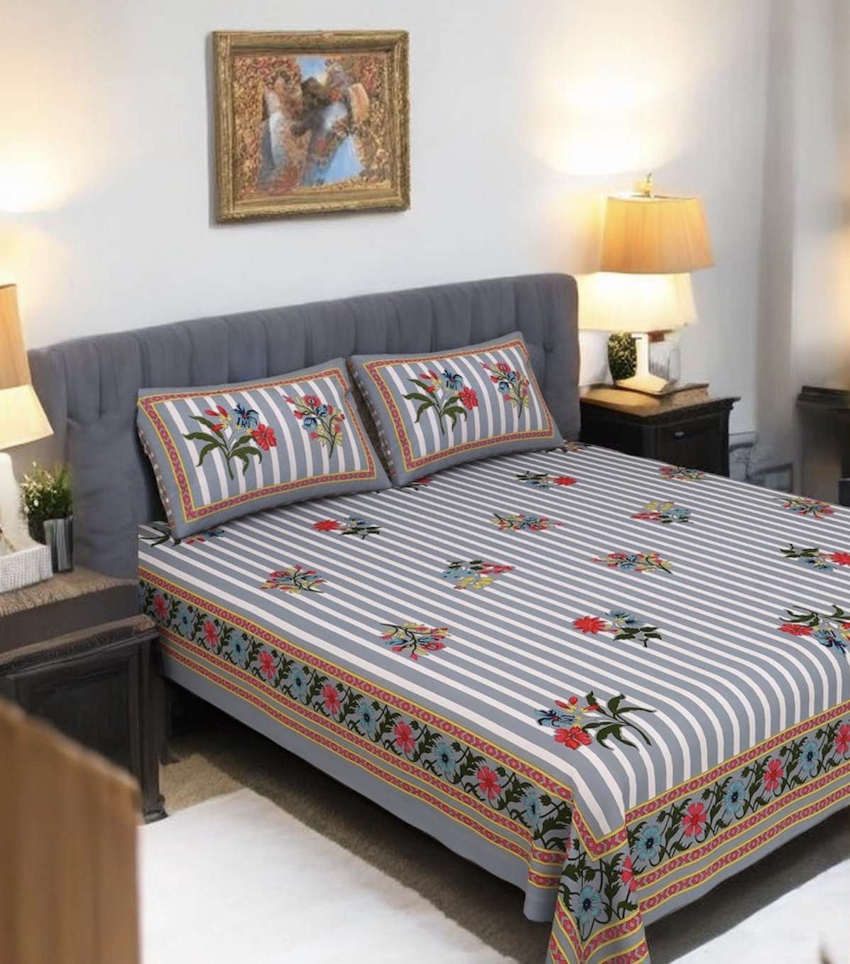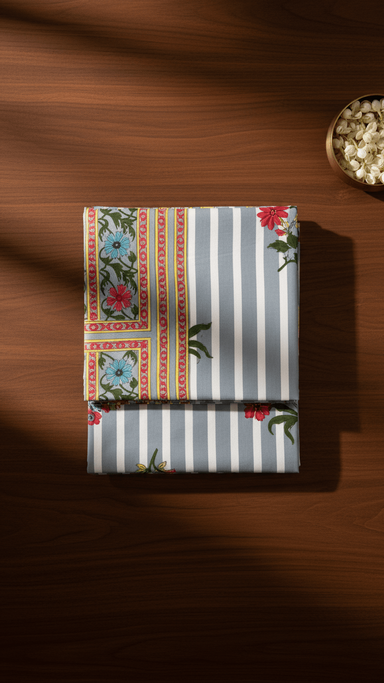 Transform your bedroom into a haven of comfort and style with this exquisite pure cotton bedsheet set. Designed for super king size beds, this generous 275×275 centimetres bedsheet offers ample coverage and a luxurious drape that enhances any bedroom décor. The charming design features classic grey and white stripes adorned with vibrant floral motifs in red, blue, and yellow, creating a perfect balance between contemporary elegance and traditional charm. The decorative border adds an extra touch of sophistication to complete the look. Crafted from 100% pure cotton, this bedsheet set ensures breathability and softness against your skin, making it ideal for year-round comfort. The natural fibres allow for excellent air circulation, keeping you cool during warmer months whilst providing cosy warmth when needed. This complete set includes two matching pillow covers that complement the bedsheet’s design beautifully, creating a coordinated look for your bedroom. The quality construction ensures durability and long-lasting colour vibrancy, even after multiple washes. Perfect for those who appreciate fine textiles and attention to detail, this bedsheet set brings together practicality and aesthetic appeal to elevate your sleeping experience.