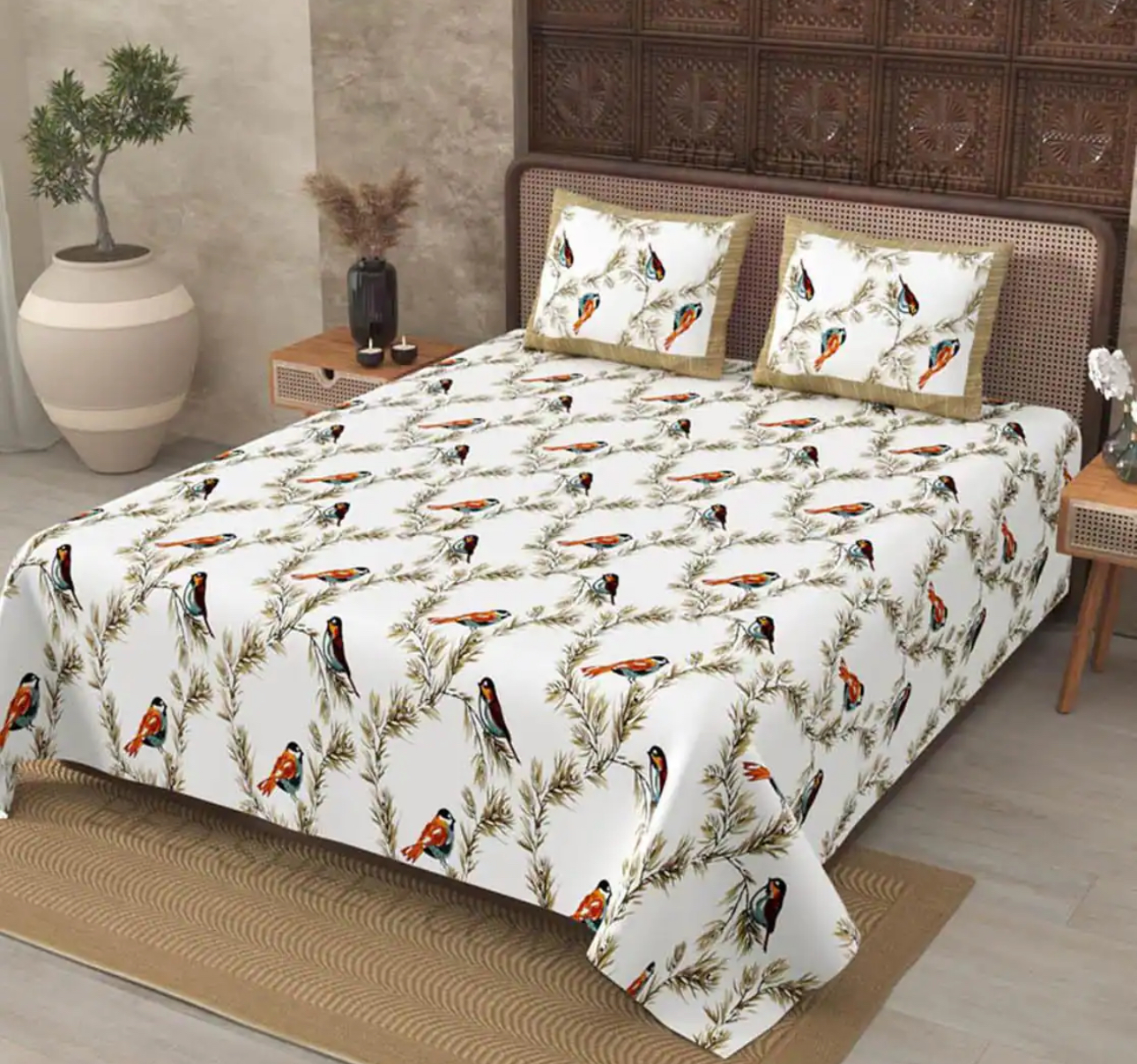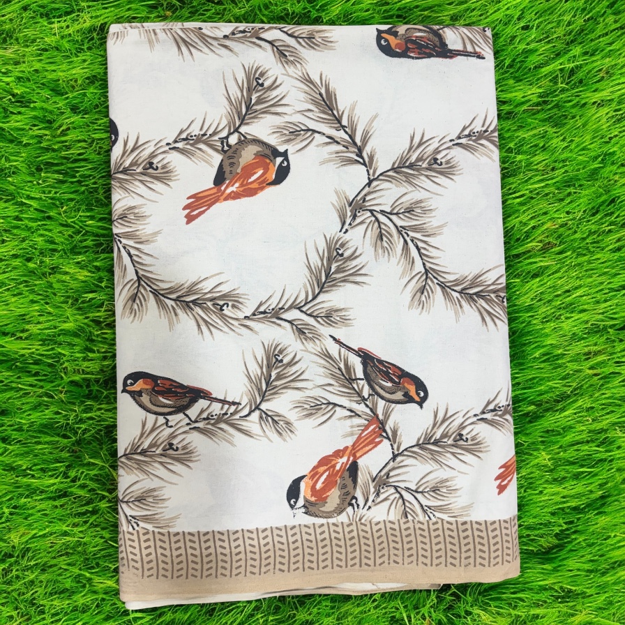 Transform your bedroom with this exquisite double bed bedsheet set featuring a charming bird print design. The pure cotton fabric, adorned with delicate grey birds perched among Brown branches, creates a serene and sophisticated atmosphere. The set includes one double bedsheet (238 x 275 cm) and two matching pillow covers, perfect for creating a coordinated look. The traditional Rajasthani block print technique brings artisanal charm to this contemporary design. The white background is beautifully complemented by a Brown geometric border pattern, adding a subtle decorative element. Crafted from high-quality cotton with a 350 thread count, this bedsheet ensures comfort and durability. The machine-washable fabric makes maintenance hassle-free. The generous dimensions provide ample coverage for standard double beds, while the pure cotton construction offers breathability and comfort in any season. This bedsheet set combines traditional craftsmanship with modern aesthetics, making it an ideal choice for those who appreciate both style and comfort in their bedroom decor.
