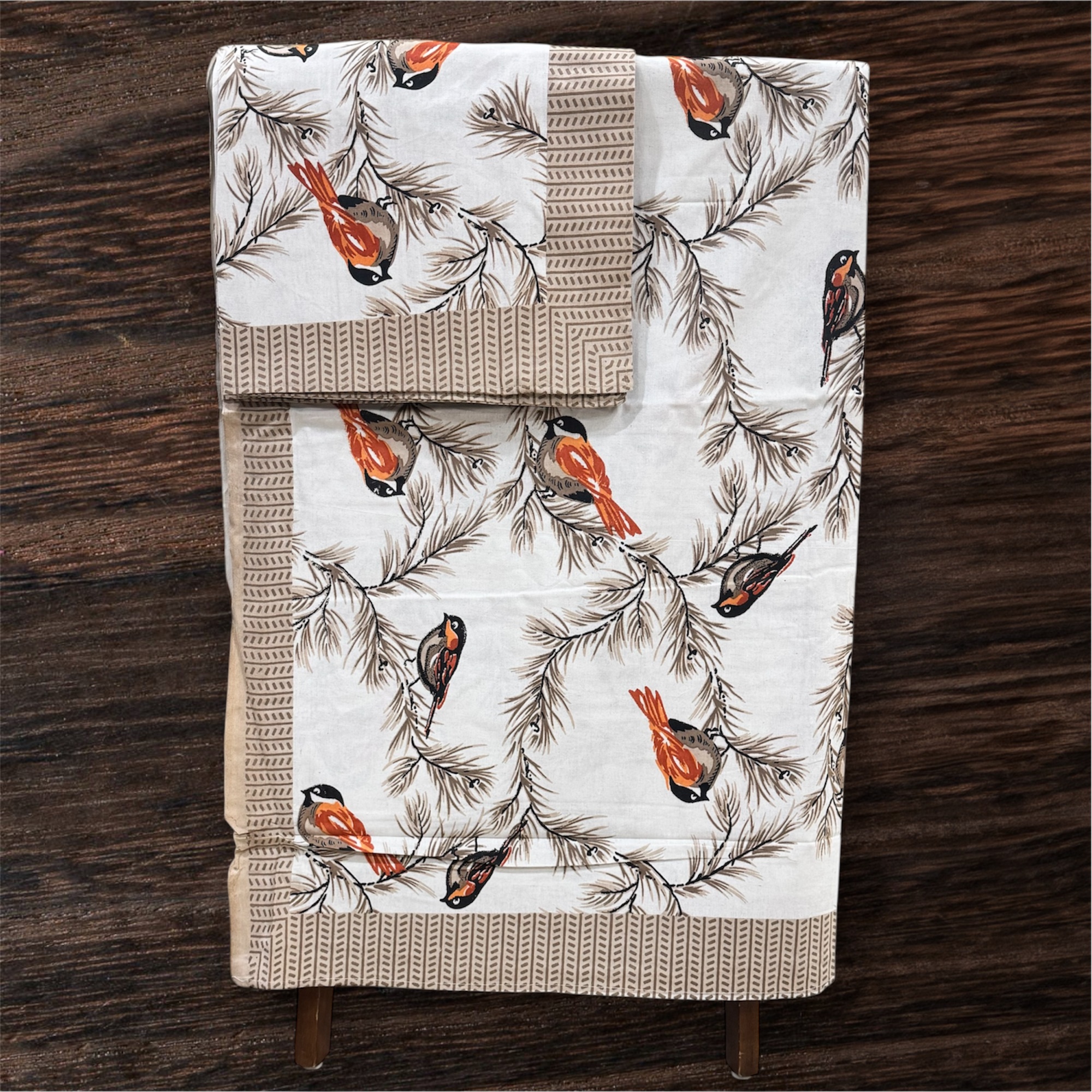 Pure Cotton Bird Print Double Bed Bedsheet Set, 93×108, with 2 Pillow Covers- BrownAvailability: In stock
