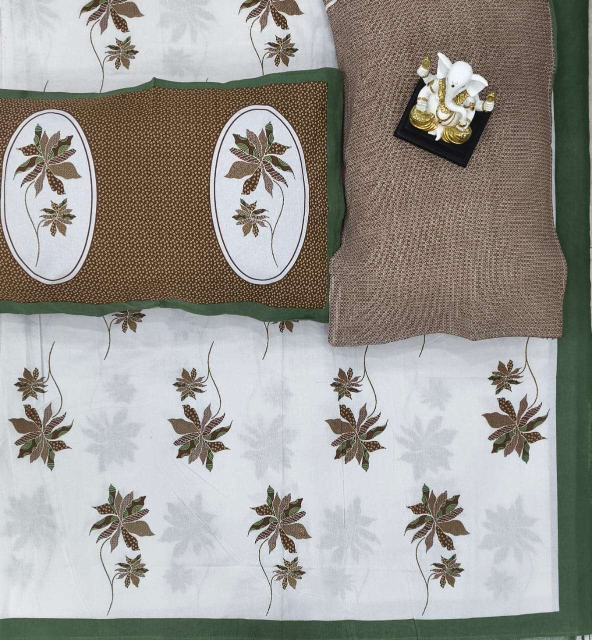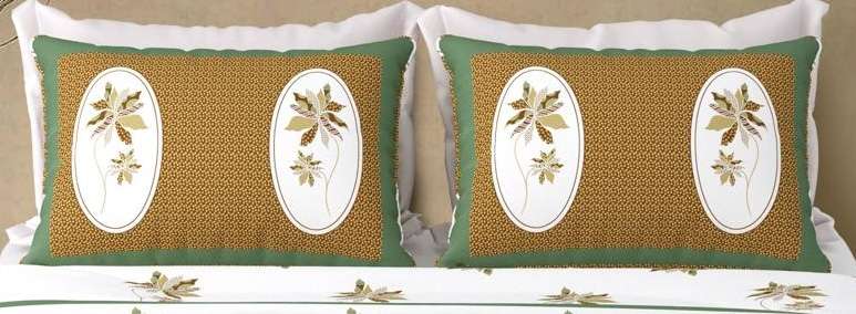 • COMPLETE BED SET: Includes a king size bedsheet along with 2 matching pillow covers featuring a distinctive golden-brown floral oval print with a green border for a coordinated bedroom aesthetic.