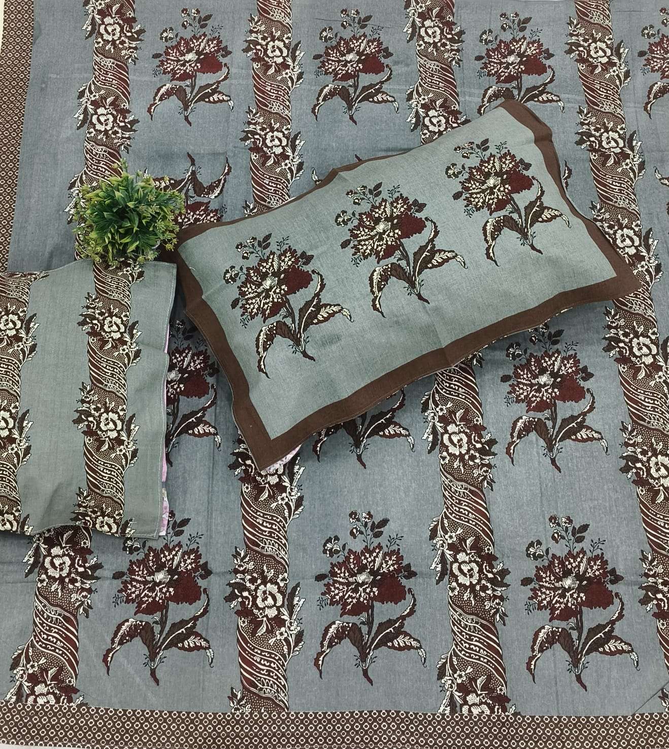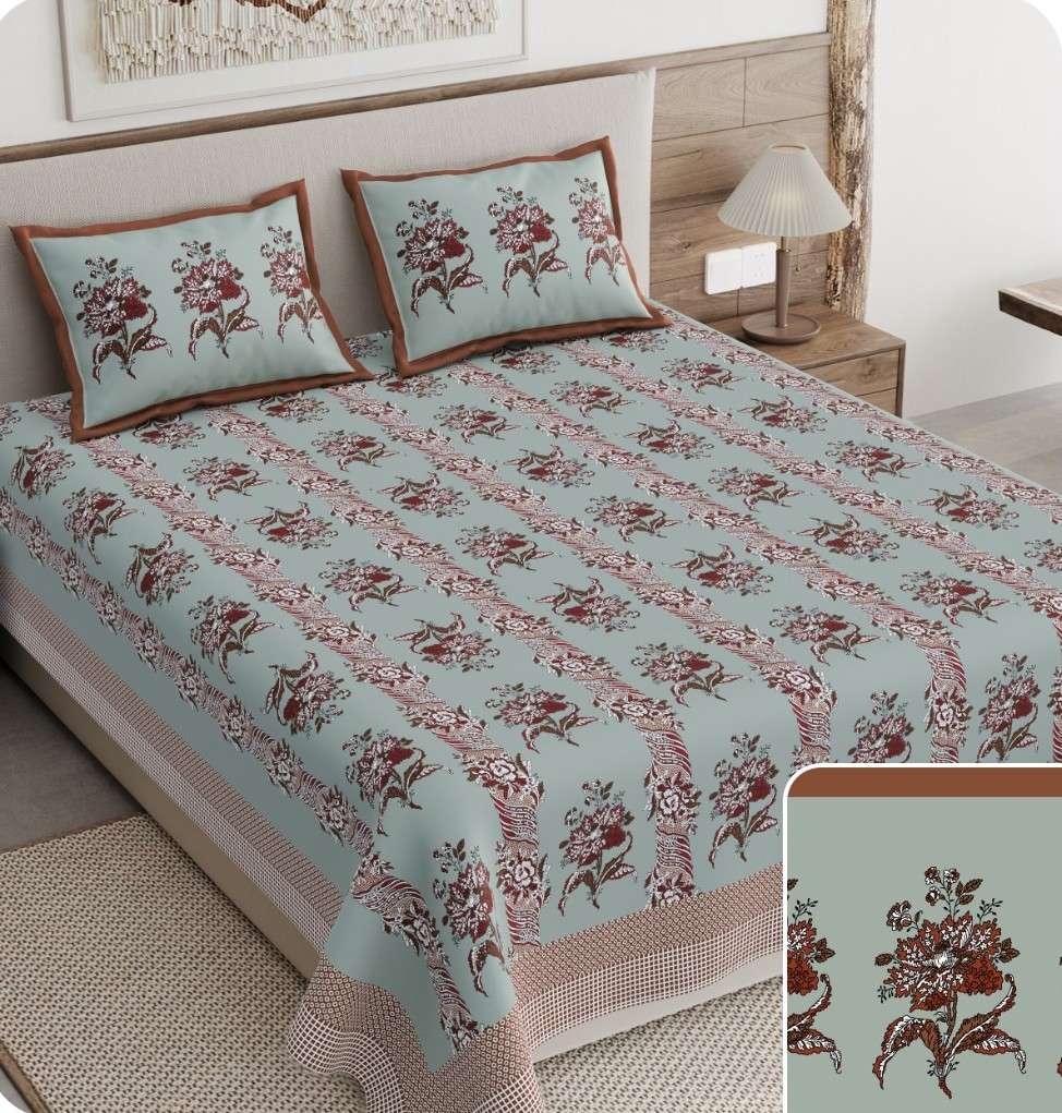 Transform your bedroom into a sanctuary of comfort and elegance with this exquisite pure cotton premium bedsheet set. Featuring an enchanting blue floral print with traditional peacock-inspired motifs on a sophisticated beige base, this generously sized bedsheet brings timeless beauty to your sleeping space. The intricate design is beautifully complemented by a striking brown border, whilst the two matching pillow covers feature coordinating patterns with brown piping for a cohesive look. Crafted from 100% pure cotton with a 340 thread count, this bedsheet set delivers exceptional breathability and luxurious softness for restful sleep throughout all seasons. Measuring an impressive 275×275 centimetres, this extra-large bedsheet provides ample coverage for king-size and larger beds with generous drape on all sides. The complete three-piece set includes one bedsheet and two pillow covers. Machine washable for convenient care, this premium quality fabric maintains its vibrant colours and softness wash after wash, ensuring long-lasting durability.