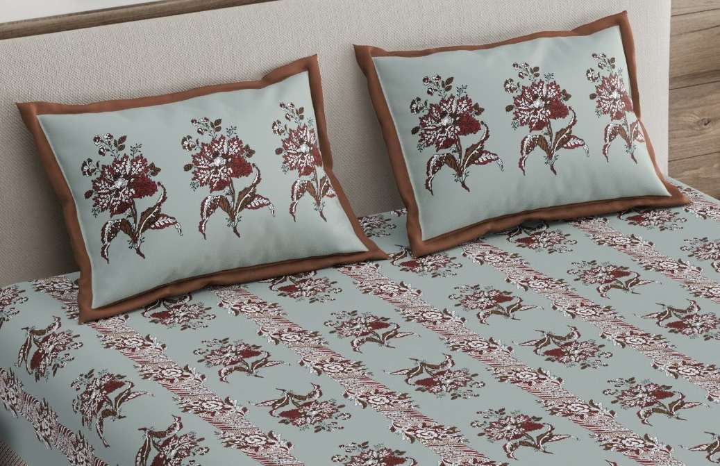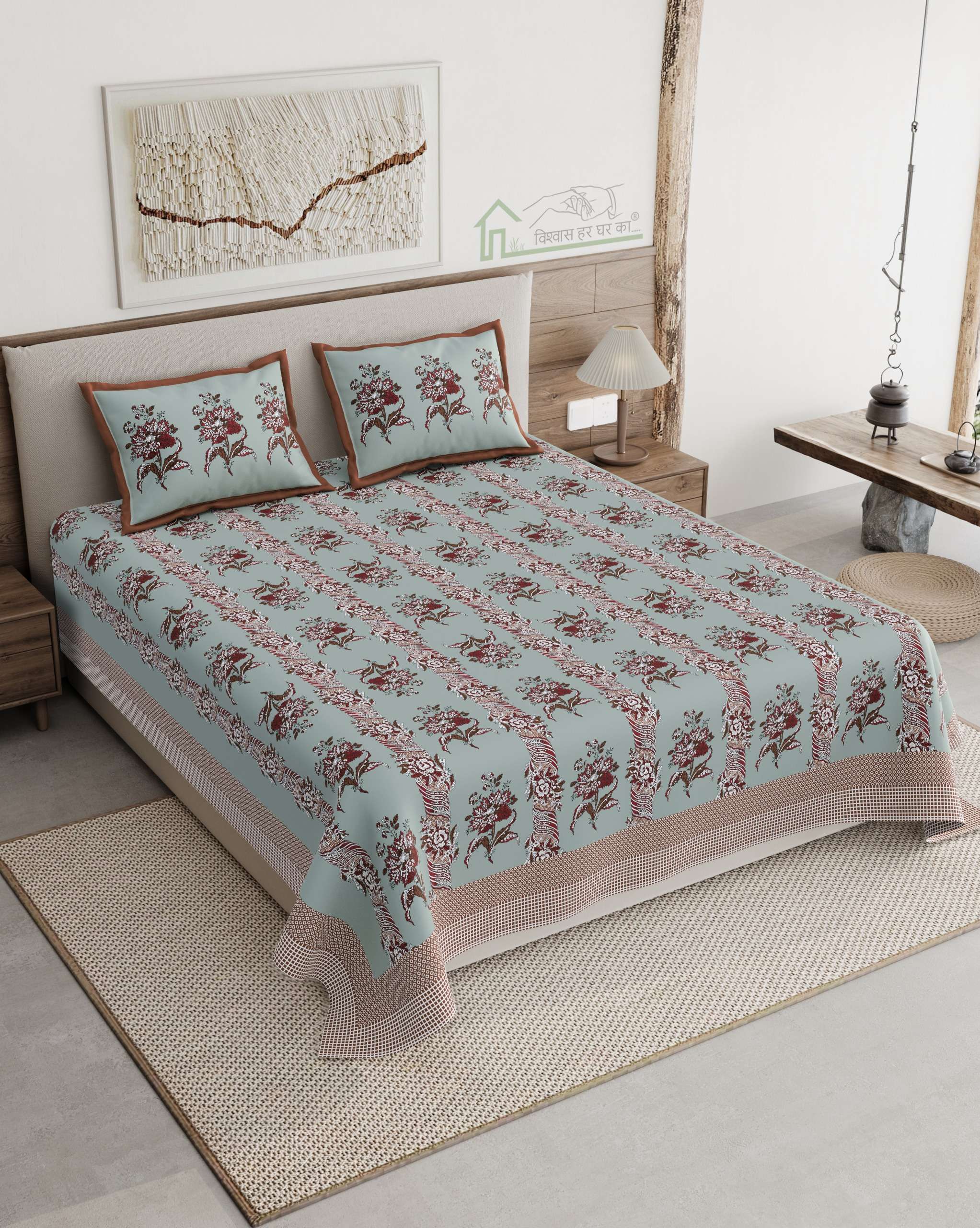 Teal Smoke Pure Cotton Premium Bedsheet Set with Red Floral Print with Brown Border, 108×108 InchesAvailability: In stock