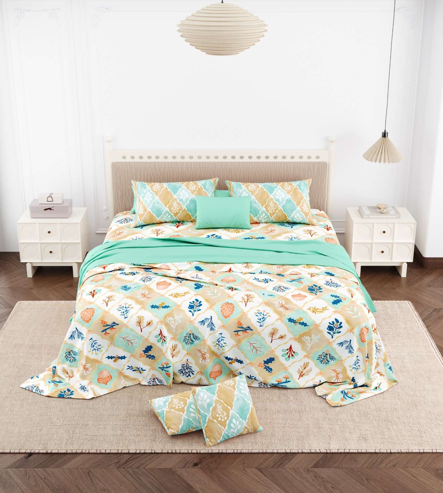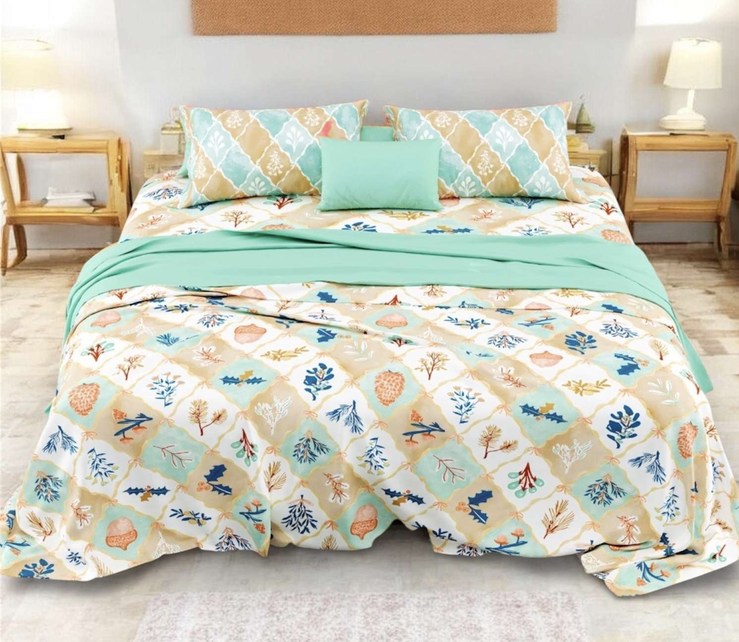 • CHARMING DESIGN: Features an elegant peacock print pattern with botanical motifs in soothing mint green, beige, and cream tones, complemented by matching geometric patterned pillow covers in a traditional style.
